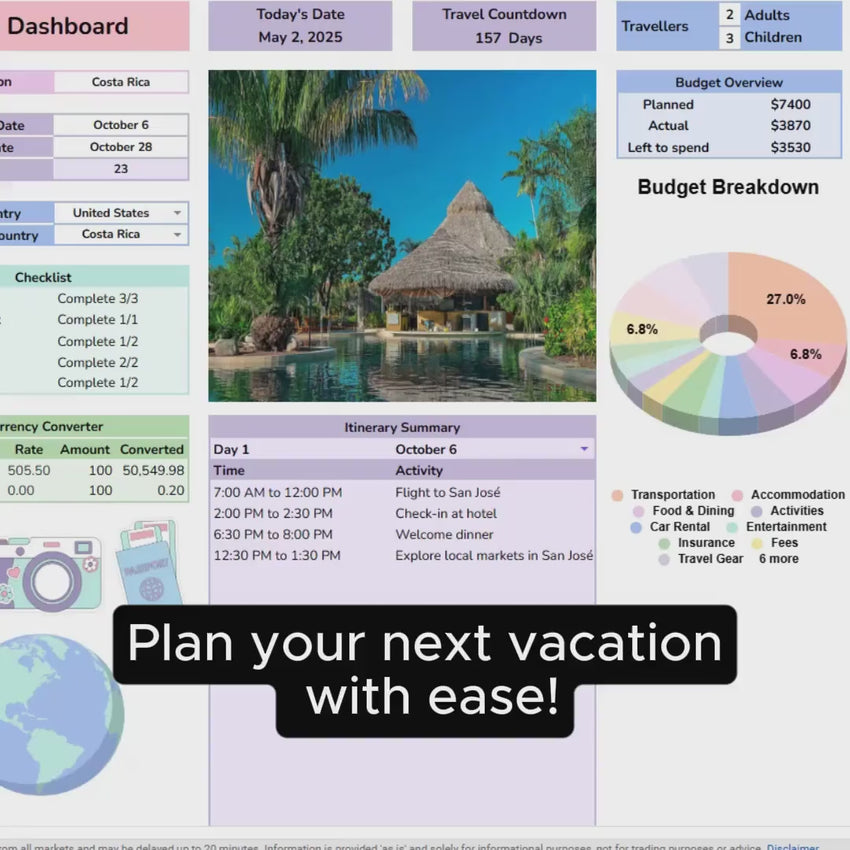 Plan your dream vacation with this all-in-one Travel Planner Spreadsheet, available for both Google Sheets and Microsoft Excel. Whether you're preparing for a weekend getaway or a long international adventure, this template helps you stay organized from start to finish. Keep everything in one place, including your budget, itinerary, packing list, reservations, and more.